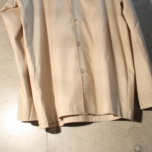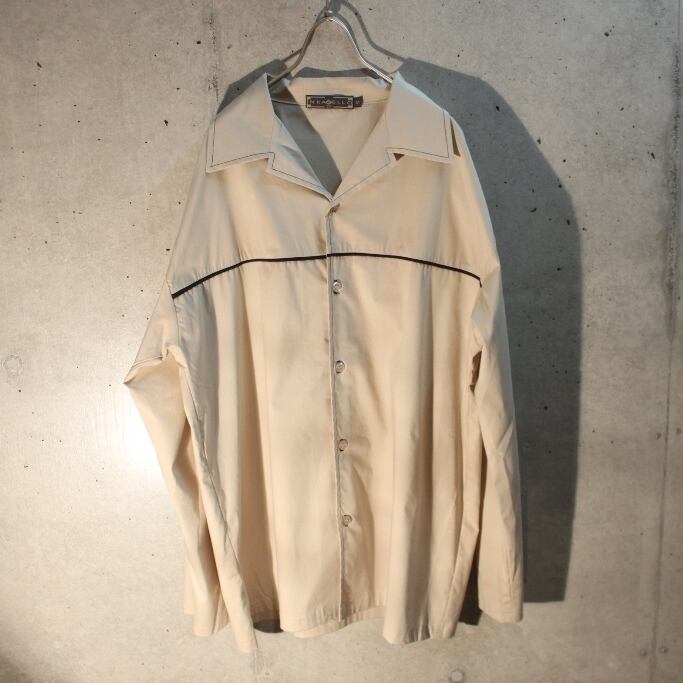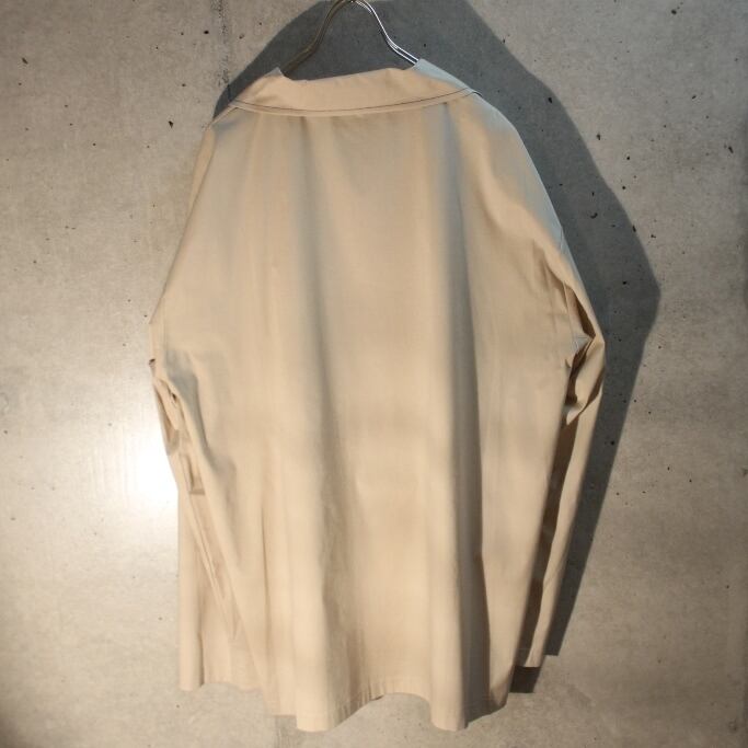何気にメイドインUSAのベージュポリ地長袖シャツ、胸元に一本ラインが入るだけの控えめデザイン、袖にはカフスが無くシャツよりよりカジュアルに使えます、生地が紙に近いポリ生地です、長袖シャツは通年使えるのでかなり重宝します。紙タグピンピンのデッドストック品です。