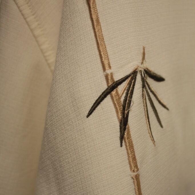 綺麗な生成りカラーに竹の笹デザインが生える1枚、肌触りが滑らかで気持ち良く、かなり着た感じが良いです、188cmのモデルが着用してジャストくらいのサイズ感、大きめなのでオーバーサイズで着たい方にもオススメ、状態は極上です。